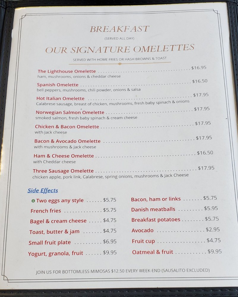 Introducing the Lighthouse Cafe, a charming spot at 1311 Bridgeway Sausalito, CA 94965. This café offers a variety of breakfast options, from classic eggs and omelettes to unique chef specials like Agustin's Stuffed Hash Brown. Customers rave about the delicious food, friendly service, and cozy atmosphere. Dishes like the Lighthouse Omelette and French Toast with fruit flambé showcase the café's commitment to quality and flavor. With gender-neutral restrooms, outdoor seating, and Wi-Fi, Lighthouse Cafe caters to a diverse range of customers. Come experience a delightful breakfast or brunch with many vegetarian options and excellent coffee. Don't miss out on the opportunity to enjoy a satisfying meal at this gem in Sausalito.